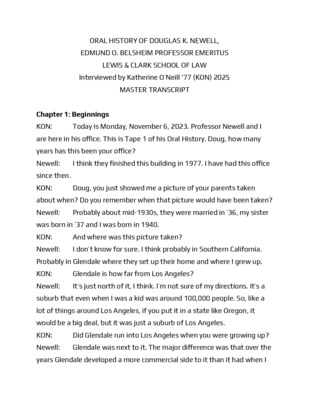 The following is the written transcript of the oral history of Edmund O. Belsheim Professor of Law Emeritus Douglas K. Newell. This transcript has been slightly edited by Professor Newell for accuracy.